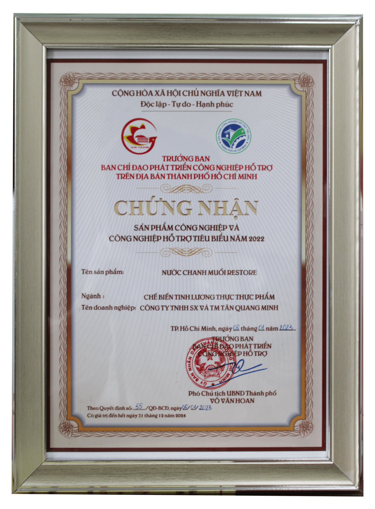 Restore Salty Lemon Drink has just been certified as a typical industrial and supporting industry product in 2022 awarded by the People’s Committee of Ho Chi Minh City.