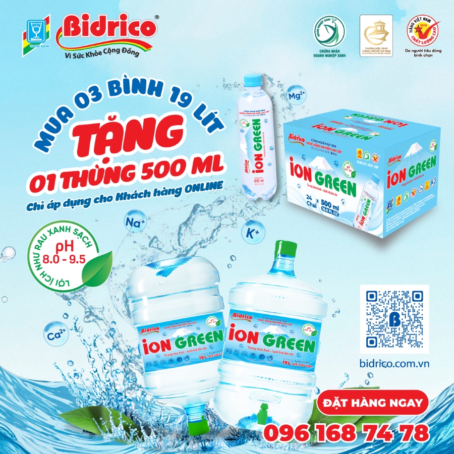 - Ưu đãi: Tặng ngay 01 thùng nước ion kiềm Ion Green chai 500ml khi mua 03 bình nước ion kiềm Ion Green 19L.