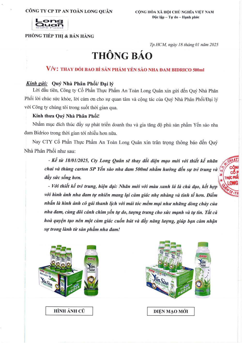 THÔNG BÁO THAY ĐỔI BAO BÌ SẢN PHẨM YẾN SÀO NHA ĐAM BIDRICO 500ML