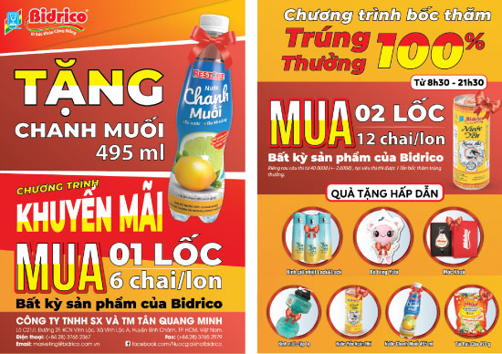 ** Chương trình 1: Chương trình khuyến mại Khách hàng khi mua 1 lốc (6 chai/lon) bất kỳ sản phẩm của Bidrico thì được tặng 1 chai Chanh muối Restore 495ml ** Chương trình 2: Bốc thăm trúng thưởng Điều kiện tham gia: – Khách hàng khi mua 2 lốc bất kỳ sản phẩm Bidrico...